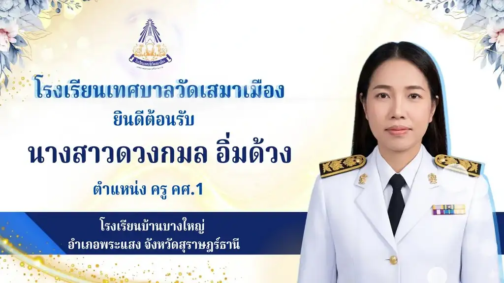 โรงเรียนเทศบาลวัดเสมาเมือง นำโดยคณะผู้บริหารและคณะครู ขอแสดงความยินดีและยินดีต้อนรับ นางสาวดวงกมล อิ่มด้วง ตำแหน่ง ครู คศ.1 เข้าสู่ครอบครัวน้ำเงิน-ขาวของเราครับ