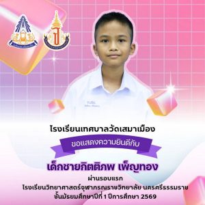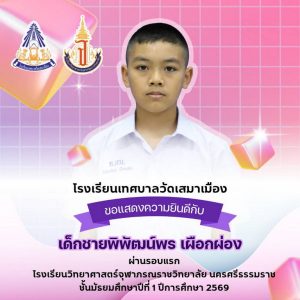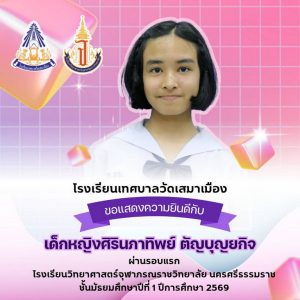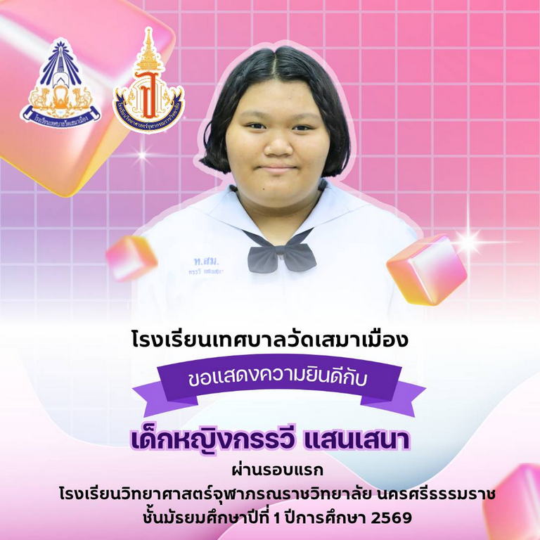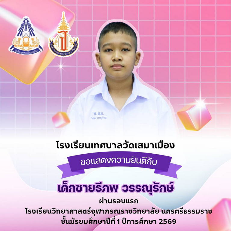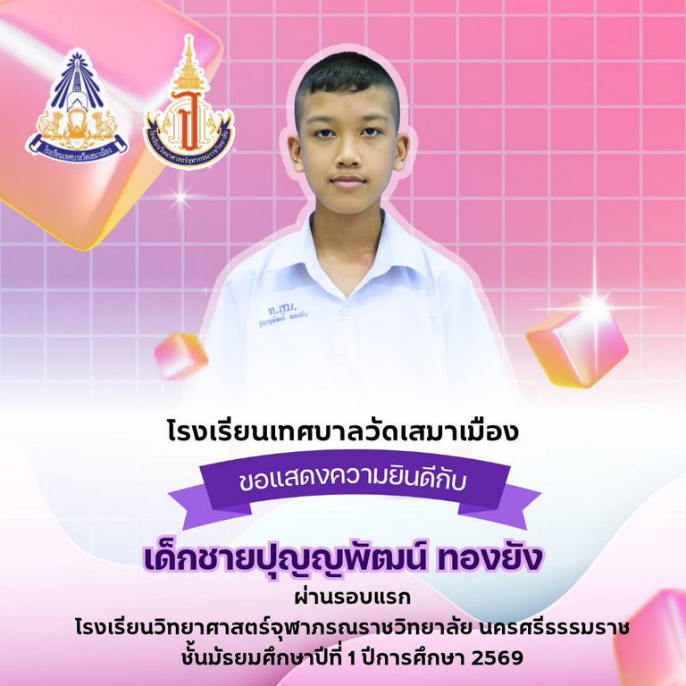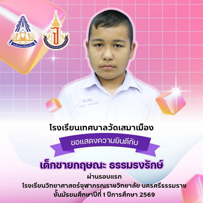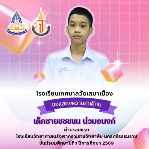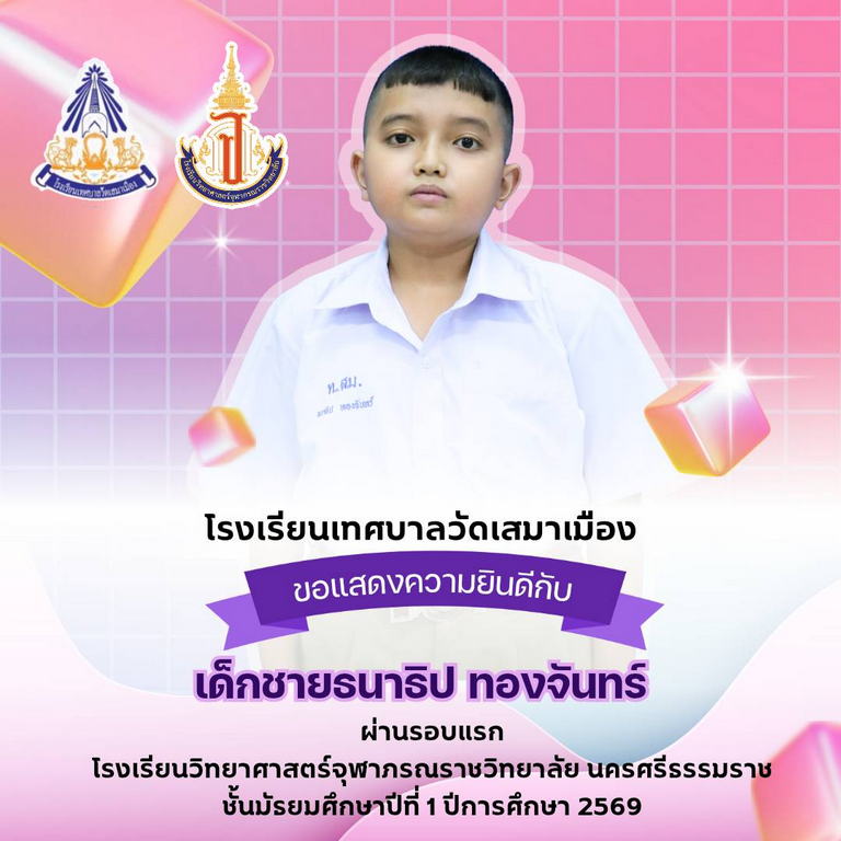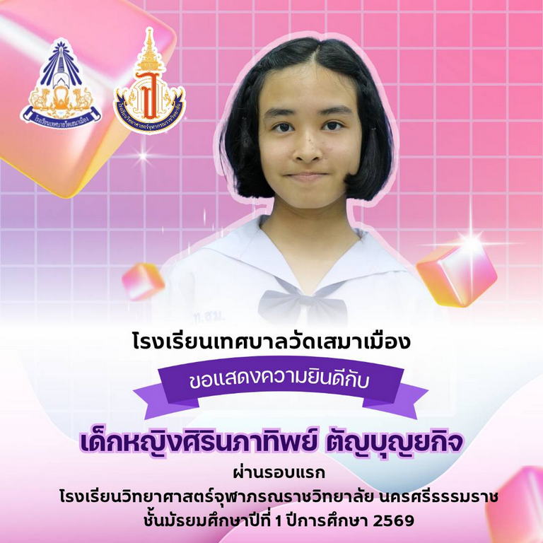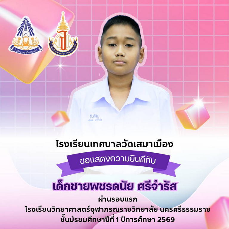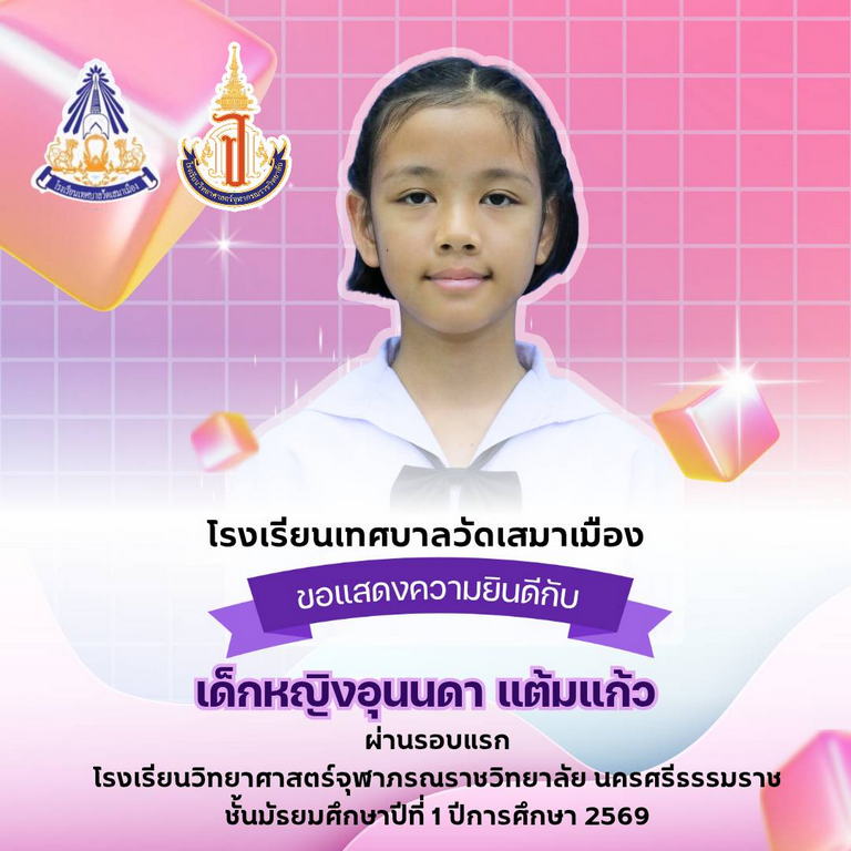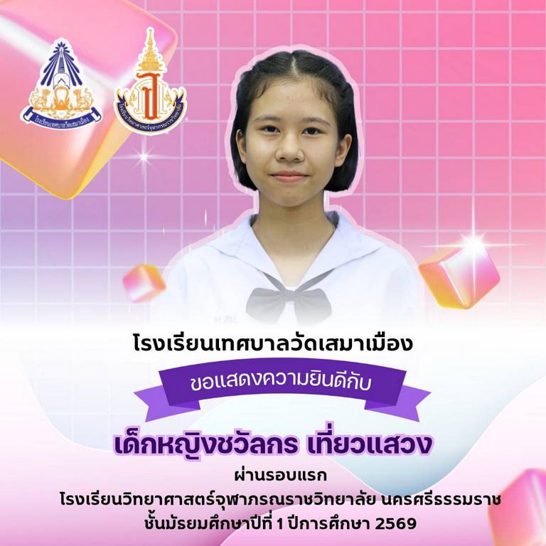โรงเรียนเทศบาลวัดเสมาเมือง ขอแสดงความยินดีและชื่นชมความสามารถอันโดดเด่นของนักเรียน 12 คน ที่ผ่านการคัดเลือก รอบแรก เข้าศึกษาต่อในระดับชั้นมัธยมศึกษาปีที่ 1 ปีการศึกษา 2569 ณ โรงเรียนวิทยาศาสตร์จุฬาภรณราชวิทยาลัย นครศรีธรรมราช ค่ะ! 👏
