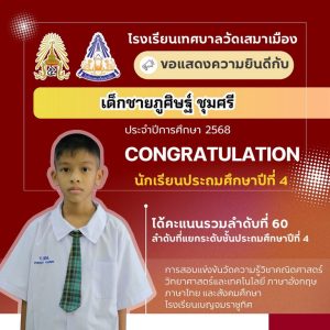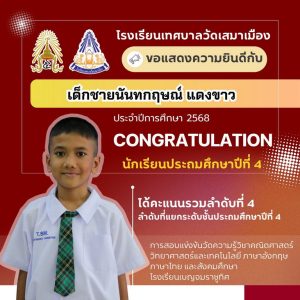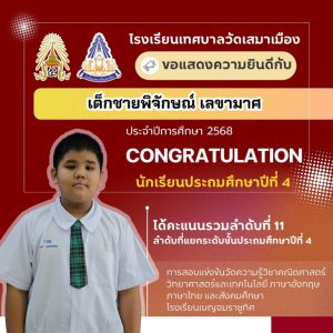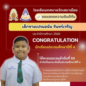 โรงเรียนเทศบาลวัดเสมาเมือง นำโดย ท่านผู้อำนวยการเกรียงไกร วุฒิมานพ พร้อมด้วยคณะผู้บริหาร และคณะครู ขอประกาศความภาคภูมิใจและร่วมแสดงความยินดีกับนักเรียนชั้น ประถมศึกษาปีที่ 4 ที่สร้างผลงานสุดยอดในการสอบแข่งขัน โครงการต้นกล้า บม. โรงเรียนเบญจมราชูทิศ ประจำปีการศึกษา 2568