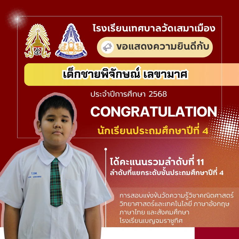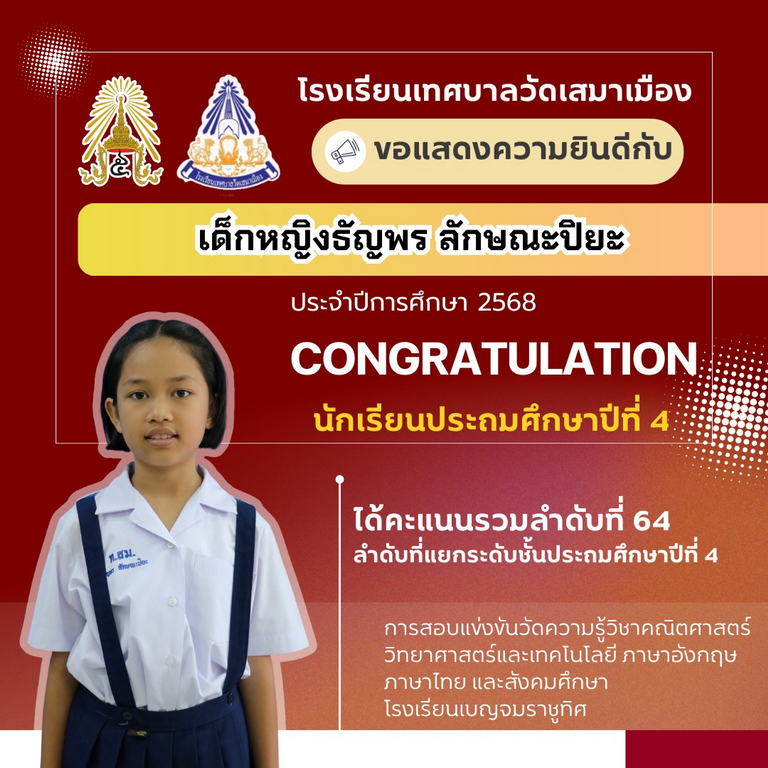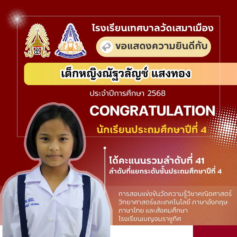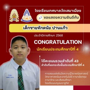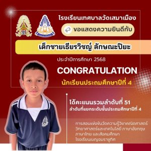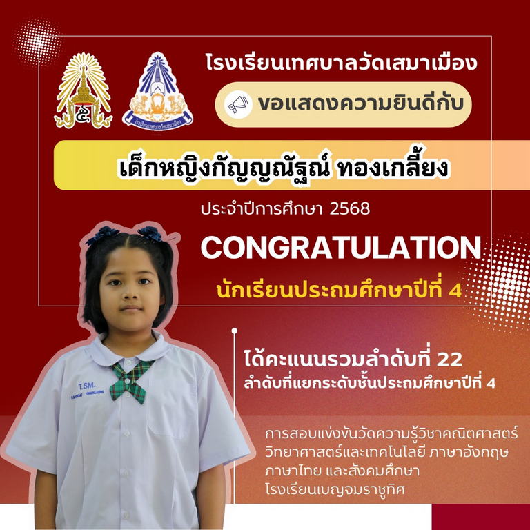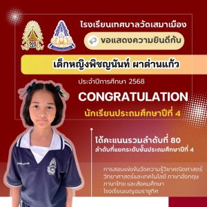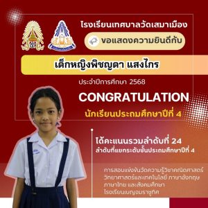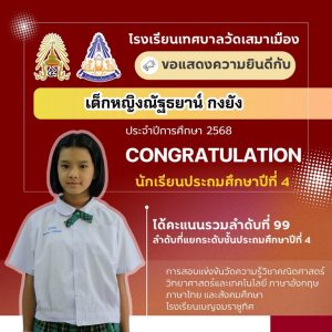 การติดอันดับ TOP 100 ในระดับจังหวัดตั้งแต่ชั้น ป.4 ถือเป็นก้าวแรกที่แข็งแกร่งมาก! โรงเรียนขอชื่นชมในความขยันหมั่นเพียรของนักเรียน และขอบพระคุณผู้ปกครองที่ให้การสนับสนุนบุตรหลานเป็นอย่างดี ขอให้ “ต้นกล้า” ทุกต้นในวันนี้ เติบโตเป็นต้นไม้ที่แข็งแรงและสร้างชื่อเสียงให้กับโรงเรียนเสมาเมืองต่อไปในอนาคต ค่ะ 💖🎓