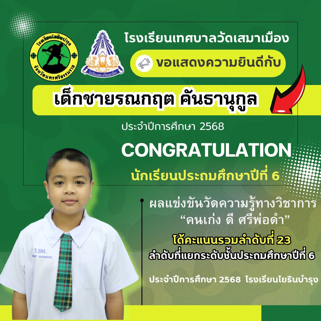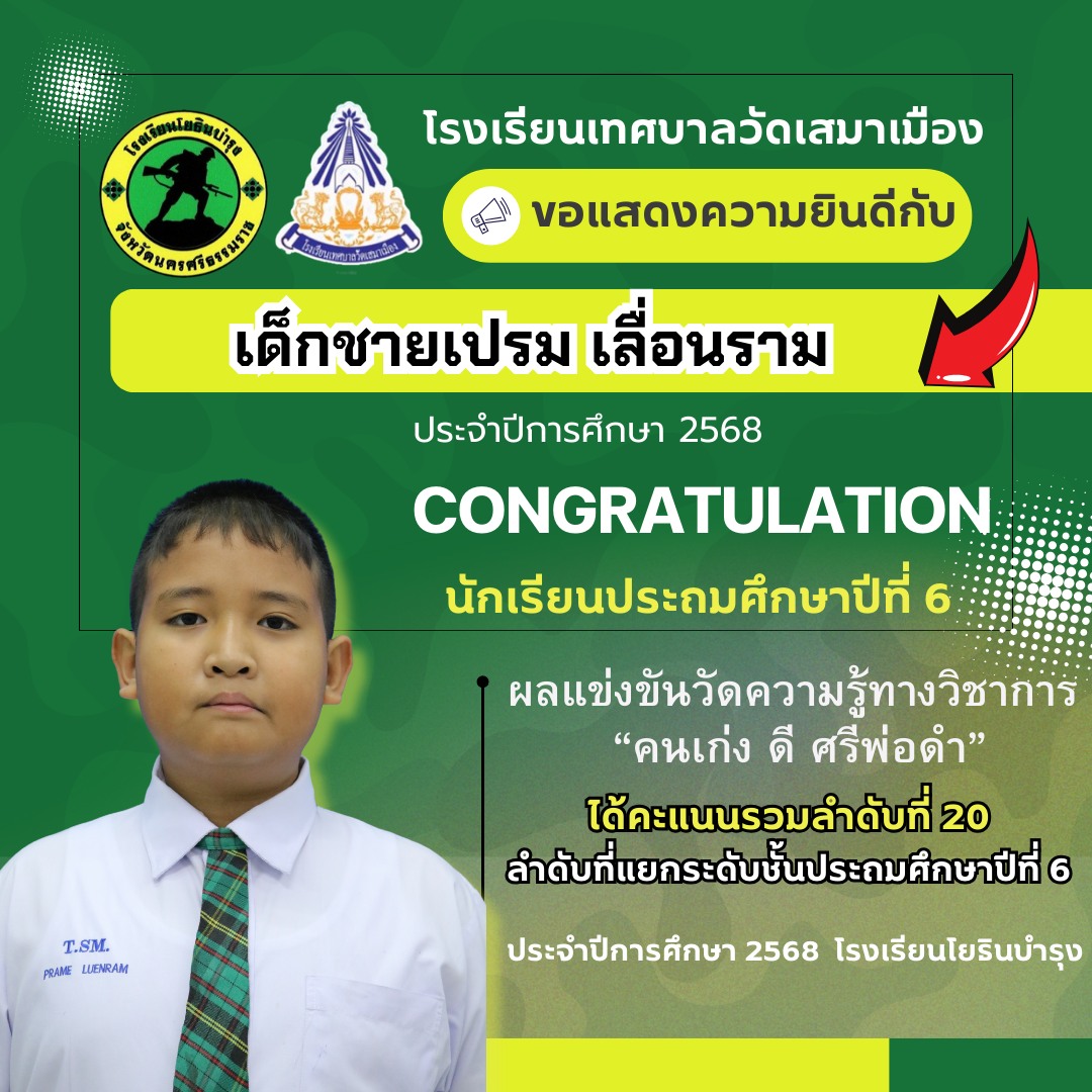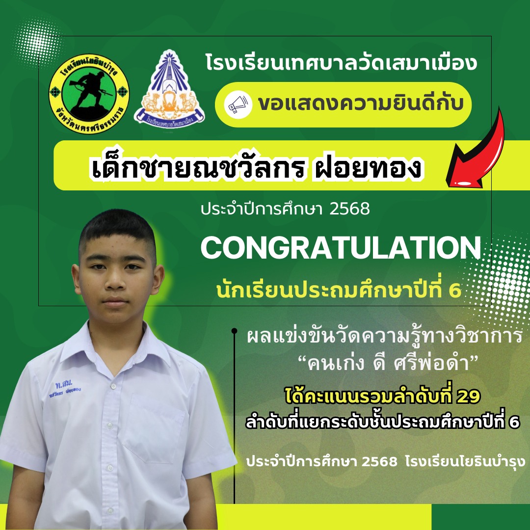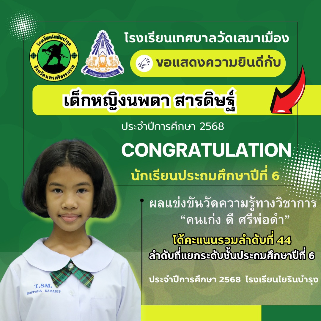 โรงเรียนเทศบาลวัดเสมาเมือง นำโดย ท่านผู้อำนวยการเกรียงไกร วุฒิมานพ พร้อมด้วยคณะผู้บริหาร และคณะครู ขอร่วมแสดงความชื่นชมและยินดีกับนักเรียนชั้น ประถมศึกษาปีที่ 6 ที่ทำผลงานได้อย่างยอดเยี่ยมในการสอบแข่งขันวัดความรู้ทางวิชาการ “คนเก่ง ดี ศรีพ่อดำ” ประจำปีการศึกษา 2568 ณ โรงเรียนโยธินบำรุง