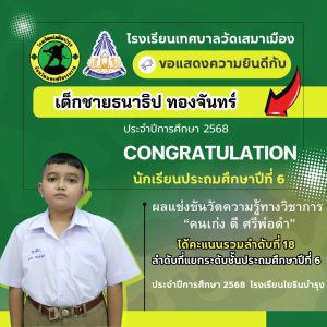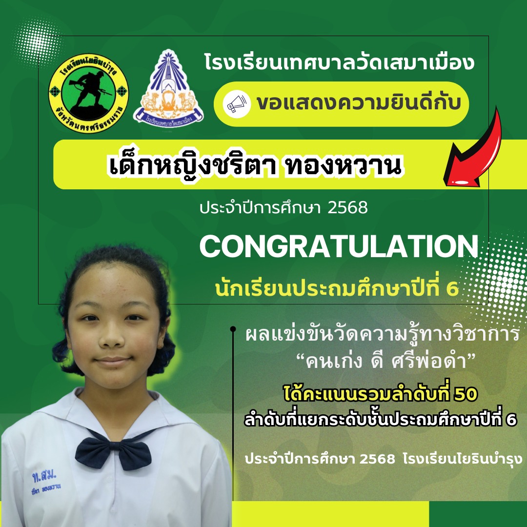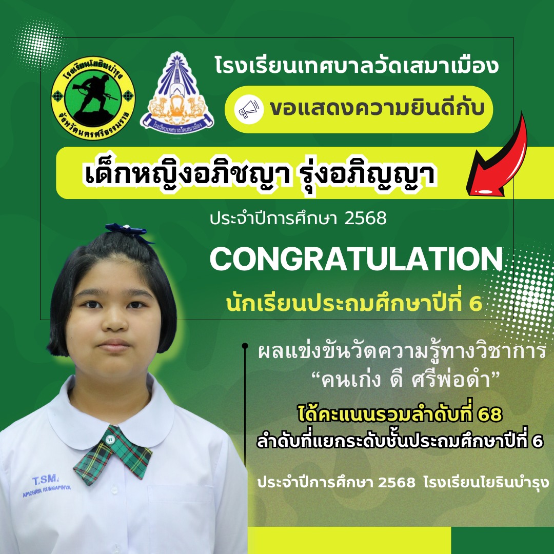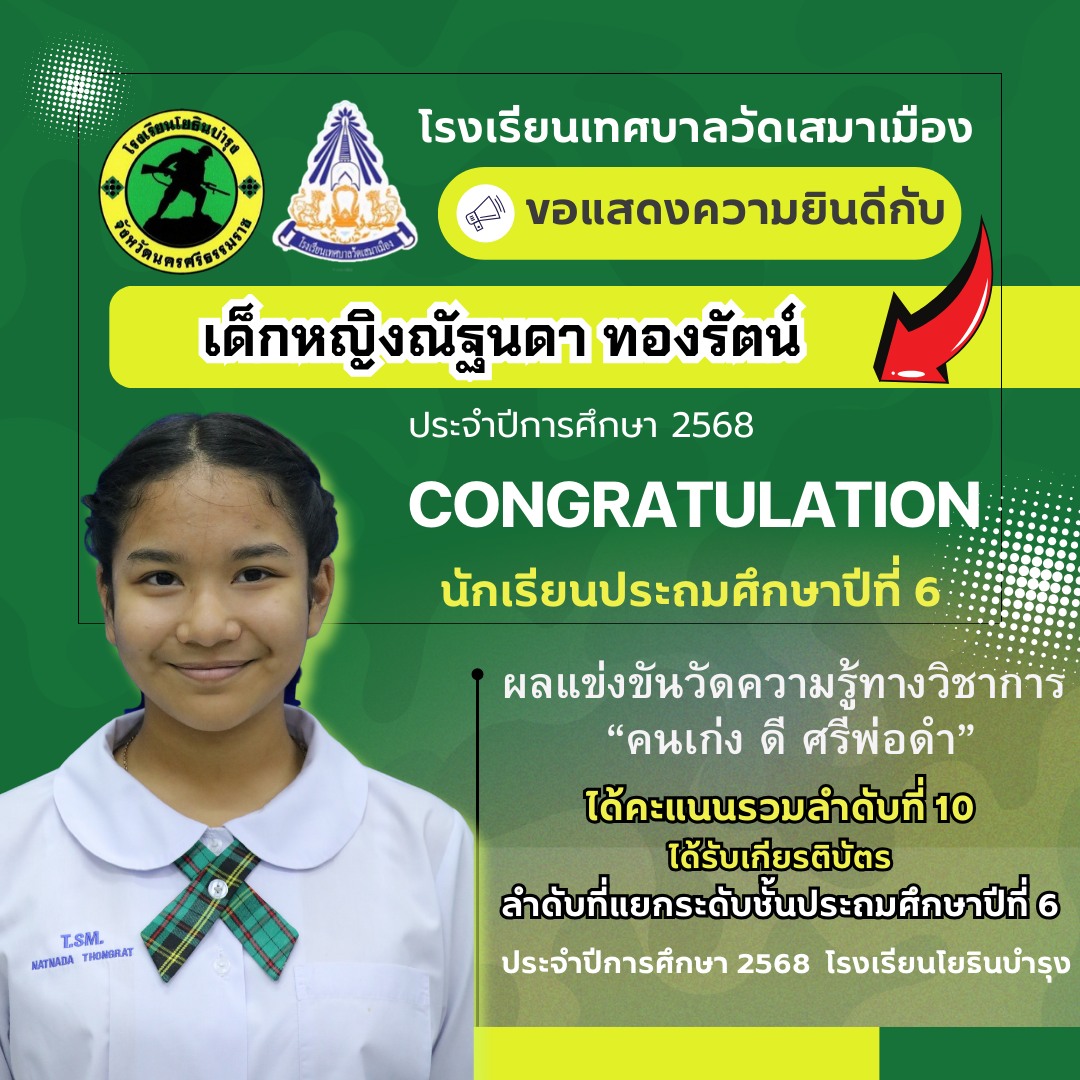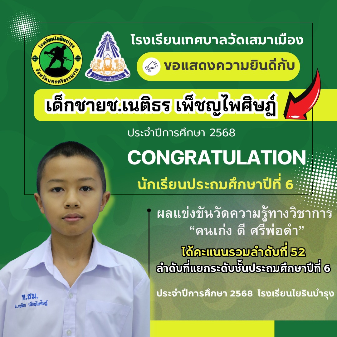 โรงเรียนเทศบาลวัดเสมาเมือง นำโดย ท่านผู้อำนวยการเกรียงไกร วุฒิมานพ พร้อมด้วยคณะผู้บริหาร และคณะครู ขอร่วมแสดงความชื่นชมและยินดีกับนักเรียนชั้น ประถมศึกษาปีที่ 6 ที่ทำผลงานได้อย่างยอดเยี่ยมในการสอบแข่งขันวัดความรู้ทางวิชาการ “คนเก่ง ดี ศรีพ่อดำ” ประจำปีการศึกษา 2568 ณ โรงเรียนโยธินบำรุง