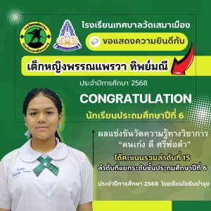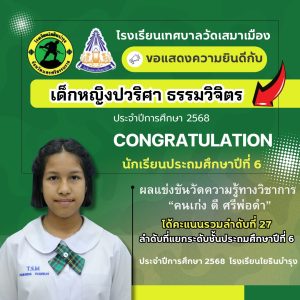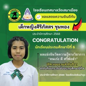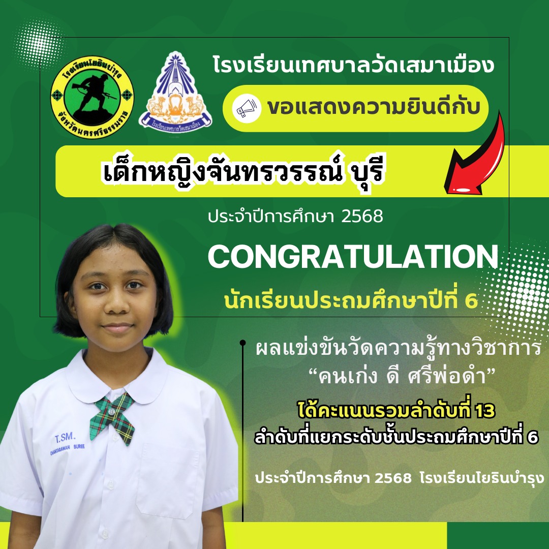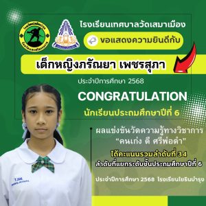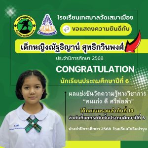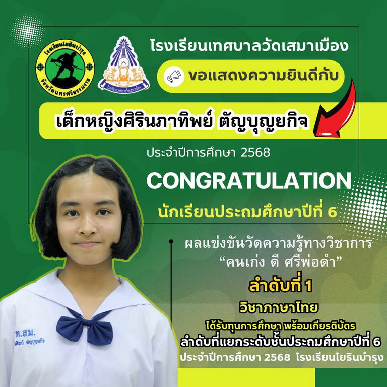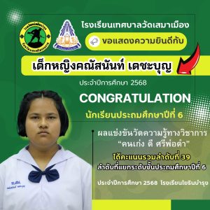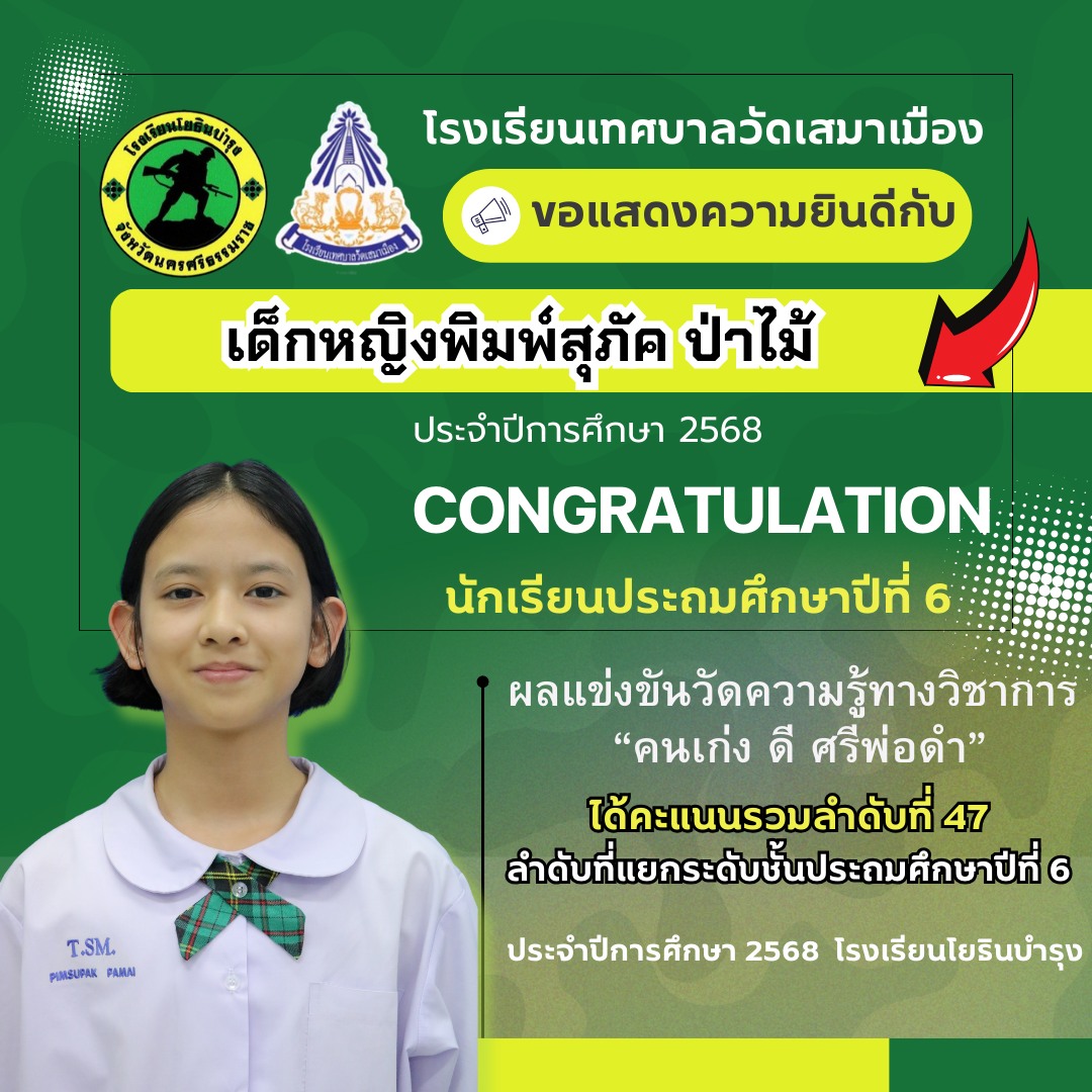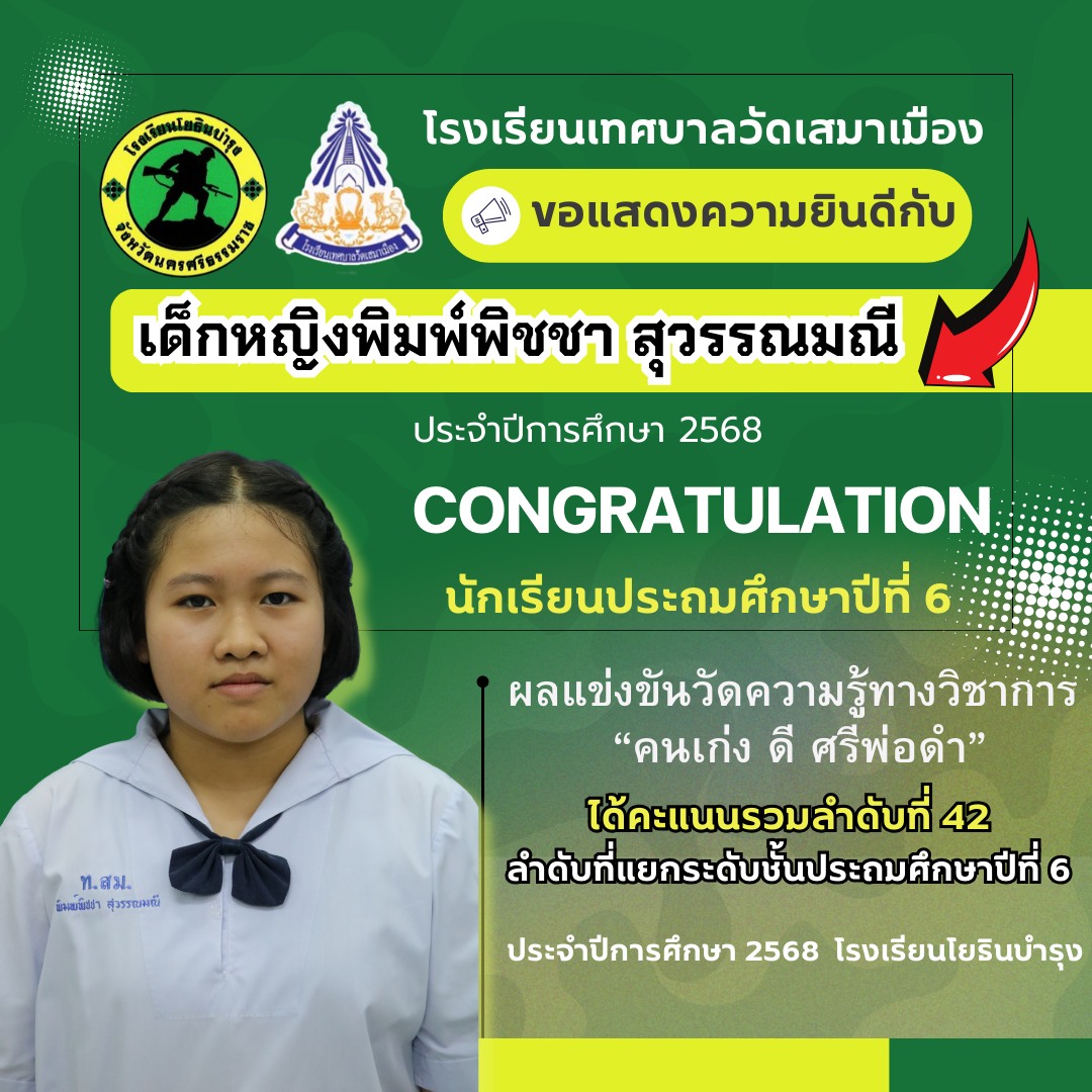โรงเรียนเทศบาลวัดเสมาเมือง นำโดย ท่านผู้อำนวยการเกรียงไกร วุฒิมานพ พร้อมด้วยคณะผู้บริหาร และคณะครู ขอร่วมแสดงความชื่นชมและยินดีกับนักเรียนชั้น ประถมศึกษาปีที่ 6 ที่ทำผลงานได้อย่างยอดเยี่ยมในการสอบแข่งขันวัดความรู้ทางวิชาการ “คนเก่ง ดี ศรีพ่อดำ” ประจำปีการศึกษา 2568 ณ โรงเรียนโยธินบำรุง