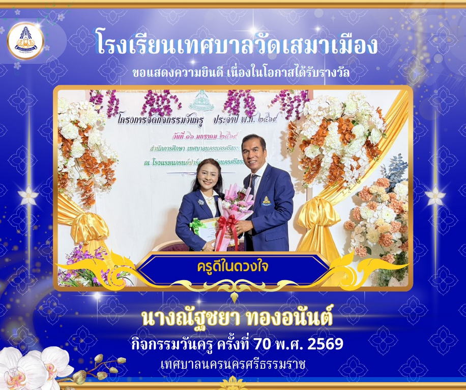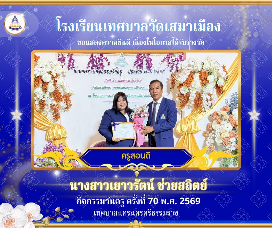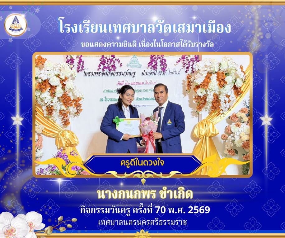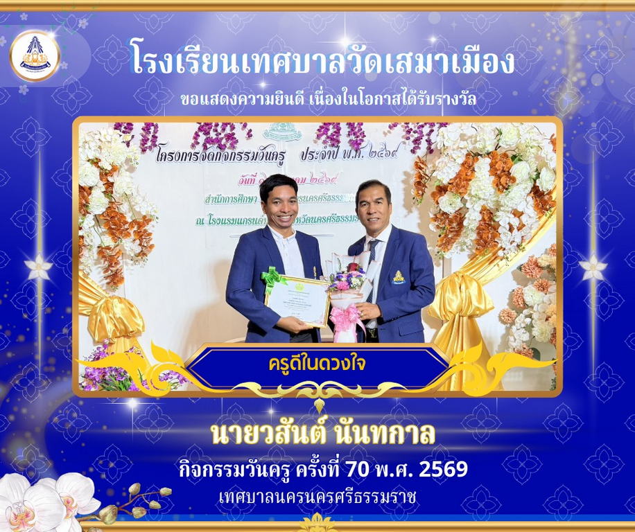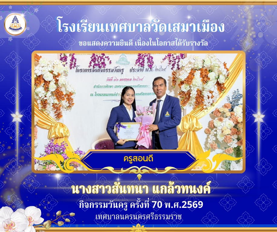 เนื่องในโอกาส วันครู ครั้งที่ 70 ประจำปี 2569 โรงเรียนเทศบาลวัดเสมาเมือง (TSM Studio) ขอร่วมภาคภูมิใจและแสดงความยินดีกับบุคลากรคนเก่งของเรา ที่ได้รับรางวัลเชิดชูเกียรติจากเทศบาลนครนครศรีธรรมราช ณ โรงแรมแกรนด์ปาร์ค
