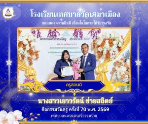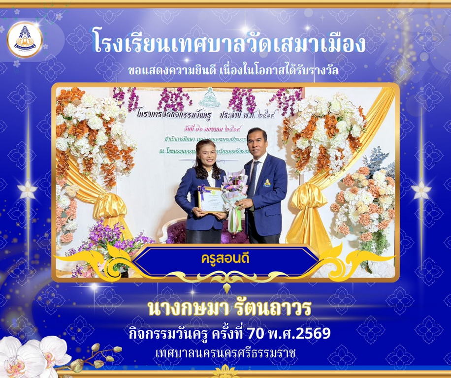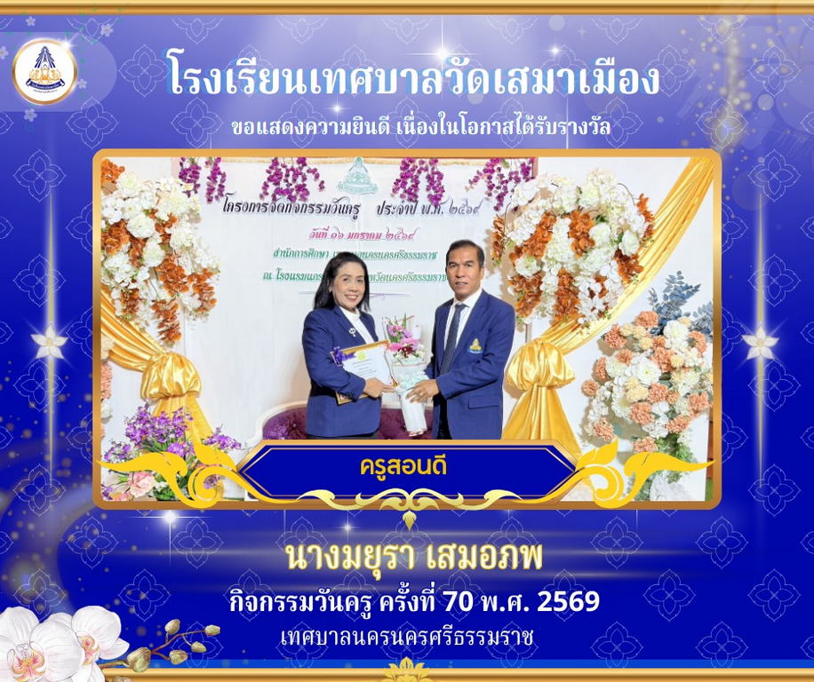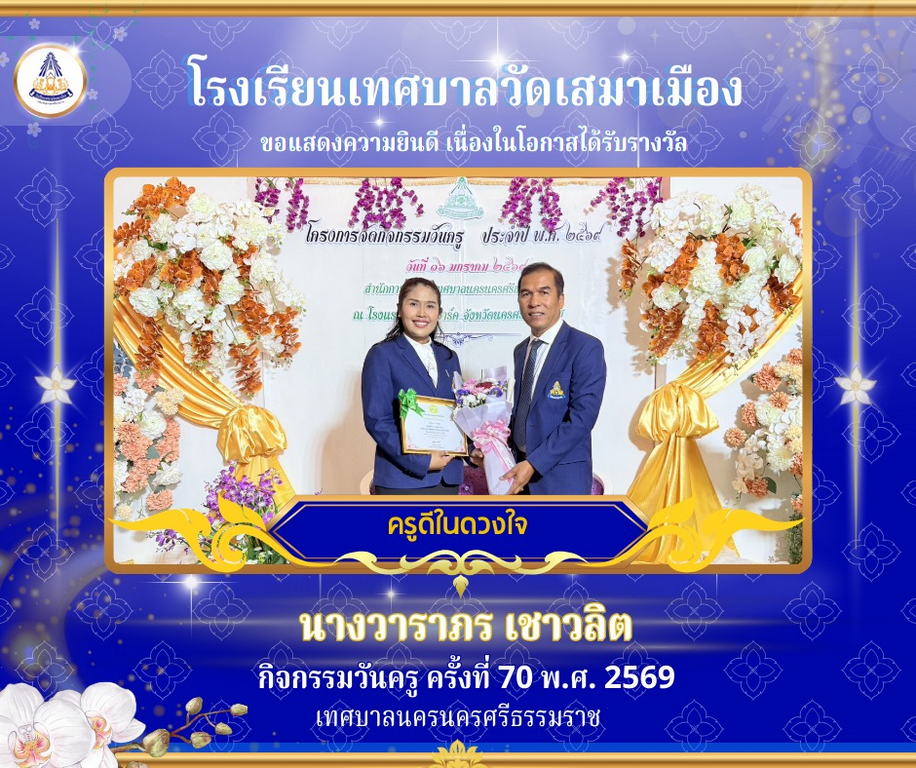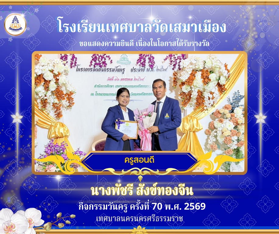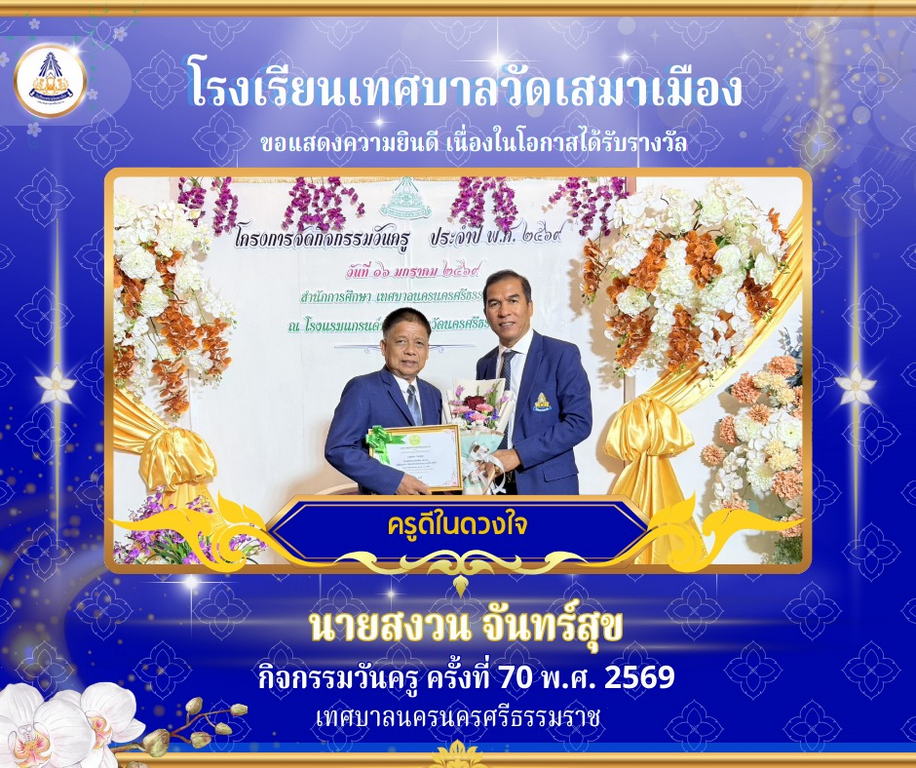 เนื่องในโอกาส วันครู ครั้งที่ 70 ประจำปี 2569 โรงเรียนเทศบาลวัดเสมาเมือง (TSM Studio) ขอร่วมภาคภูมิใจและแสดงความยินดีกับบุคลากรคนเก่งของเรา ที่ได้รับรางวัลเชิดชูเกียรติจากเทศบาลนครนครศรีธรรมราช ณ โรงแรมแกรนด์ปาร์ค