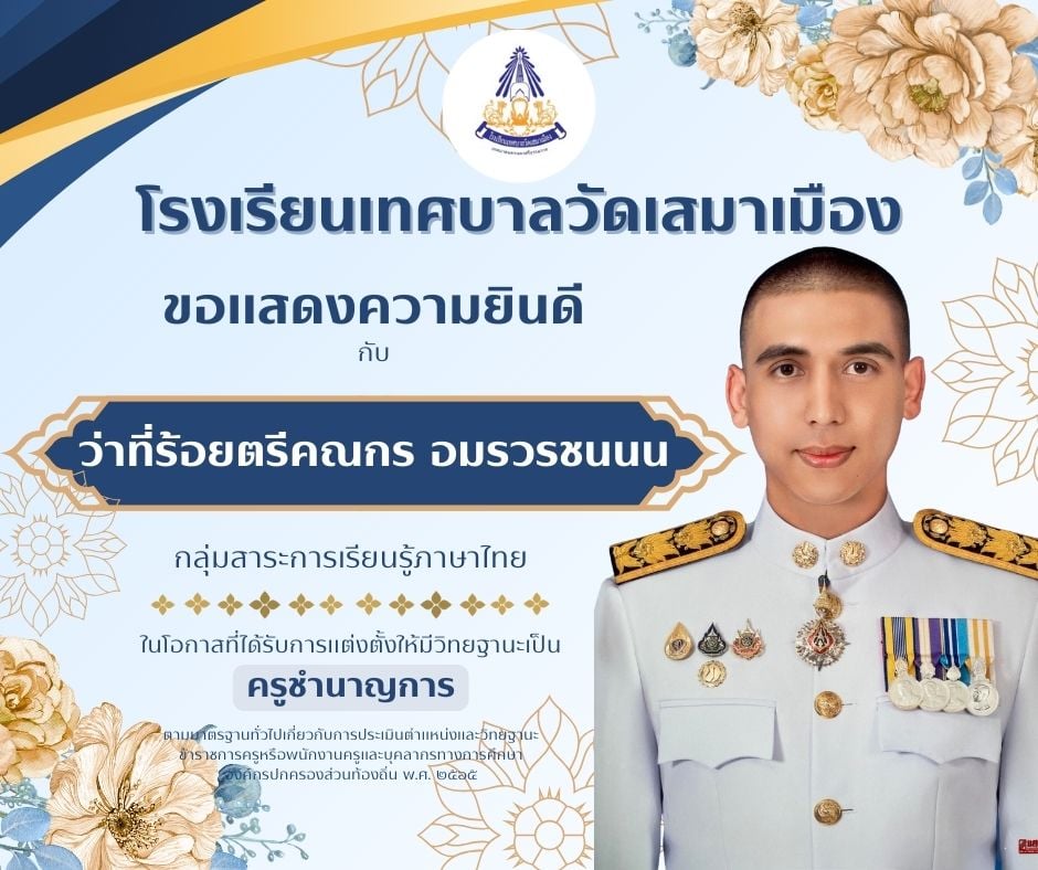 โรงเรียนเทศบาลวัดเสมาเมือง ขอแสดงความยินดีอย่างยิ่งกับว่าที่ร้อยตรีคณกร อมรวรชนนน กลุ่มสาระการเรียนรู้ภาษาไทย