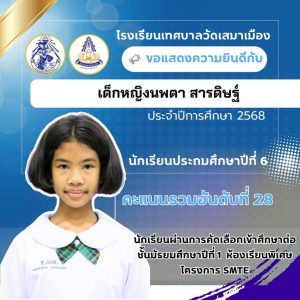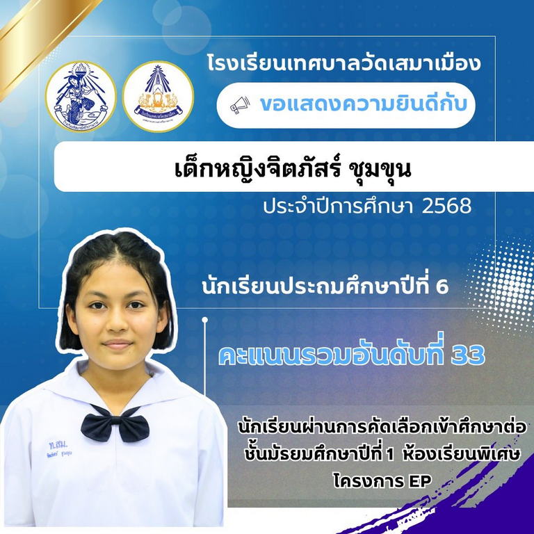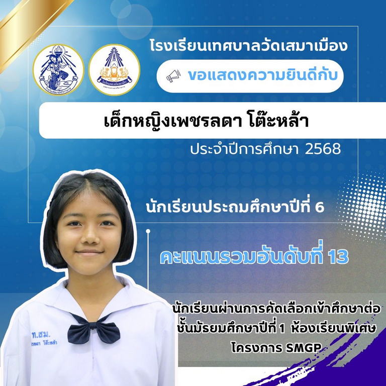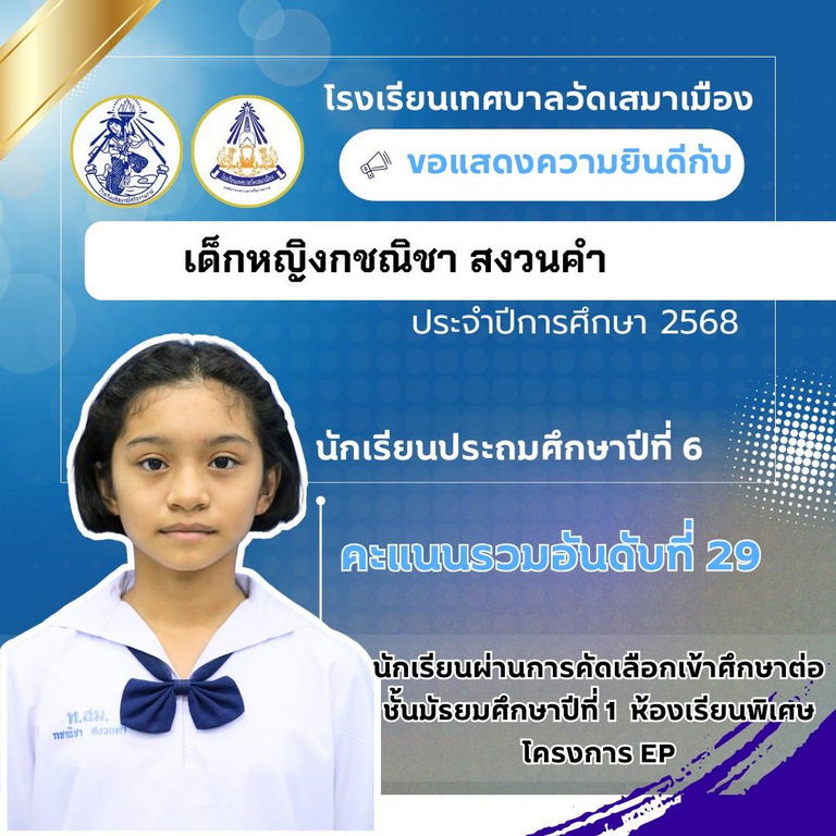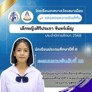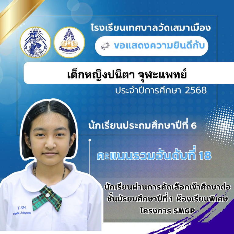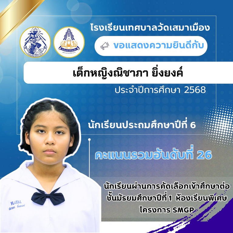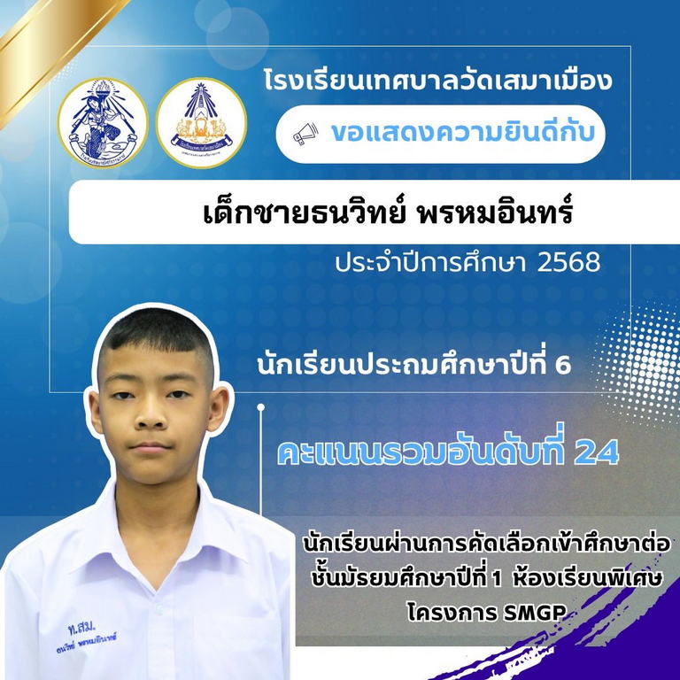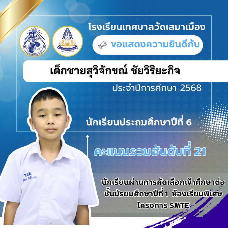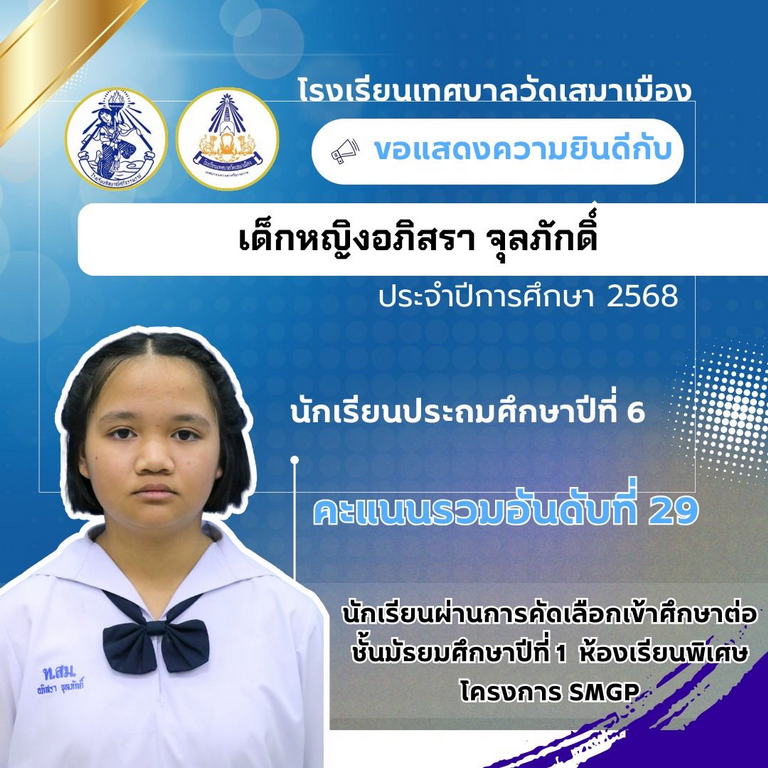 โรงเรียนเทศบาลวัดเสมาเมือง นำโดย นายเกรียงไกร วุฒิมานพ คณะผู้บริหาร คณะครู และบุคลากร ขอแสดงความยินดีกับนักเรียนชั้นประถมศึกษาปีที่ 6 ที่สอบผ่านการคัดเลือกเข้าศึกษาต่อชั้นมัธยมศึกษาปีที่ 1 ห้องเรียนพิเศษโครงการ SMGP , SMTE และ EP โรงเรียนกัลยาณีศรีธรรมราช