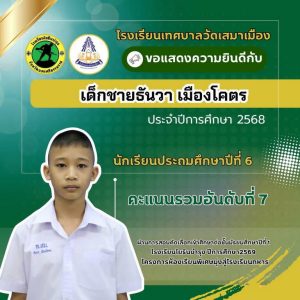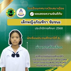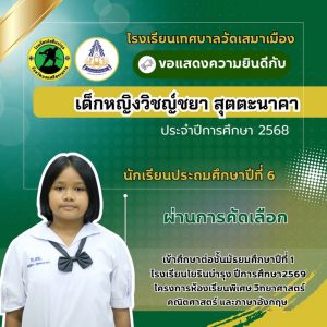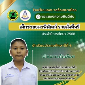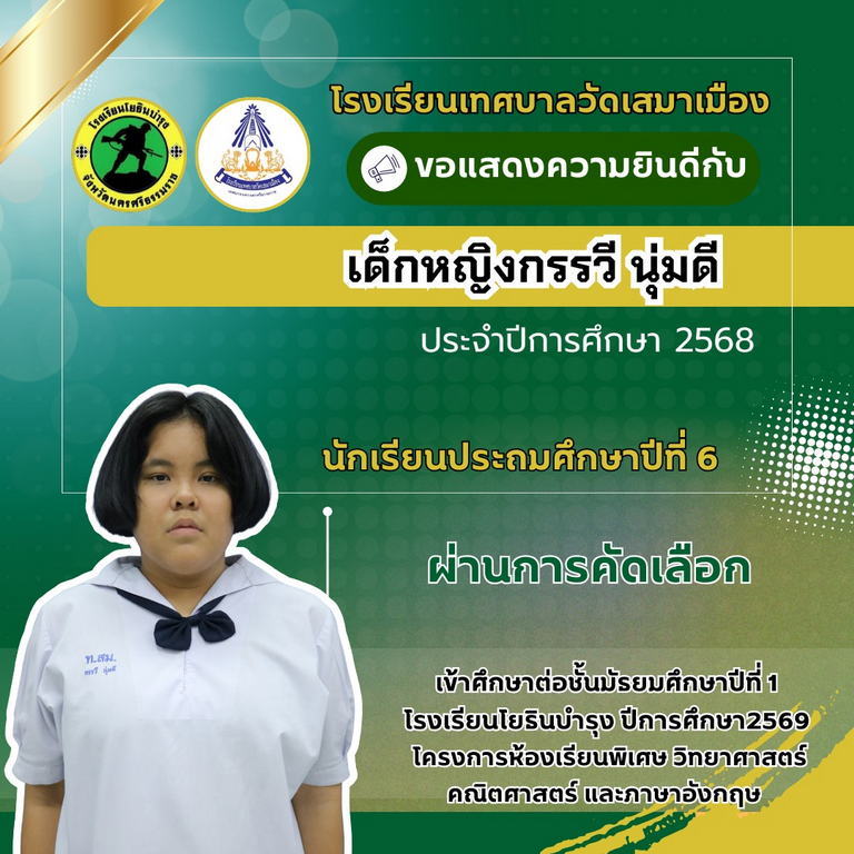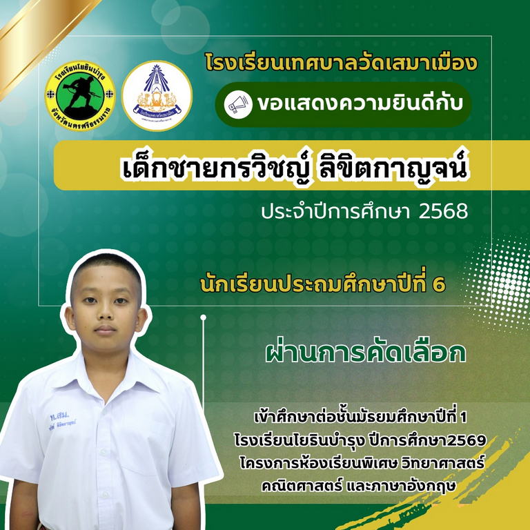 นายเกรียงไกร วุฒิมานพ ผู้อำนวยการสถานศึกษา พร้อมด้วยคณะผู้บริหาร คณะครู และบุคลากรโรงเรียนเทศบาลวัดเสมาเมือง ขอแสดงความยินดีกับนักเรียนชั้นประถมศึกษาปีที่ 6 ที่ผ่านการสอบคัดเลือกเข้าศึกษาต่อระดับชั้นมัธยมศึกษาปีที่ 1 โรงเรียนโยธินบำรุง ปีการศึกษา 2569