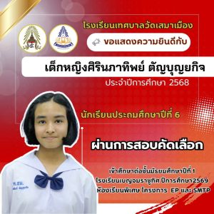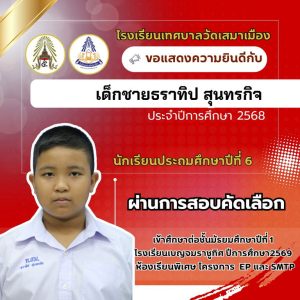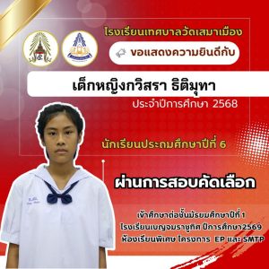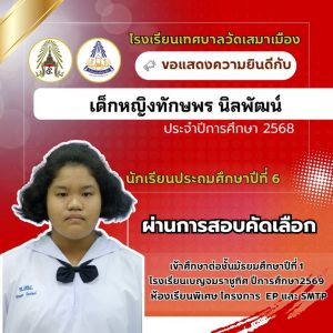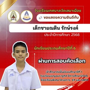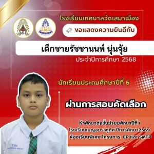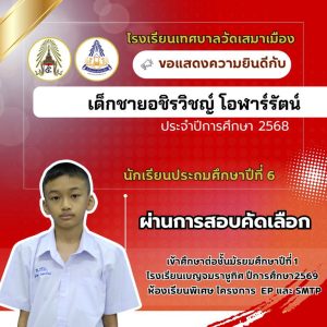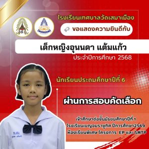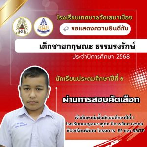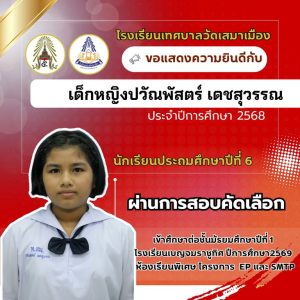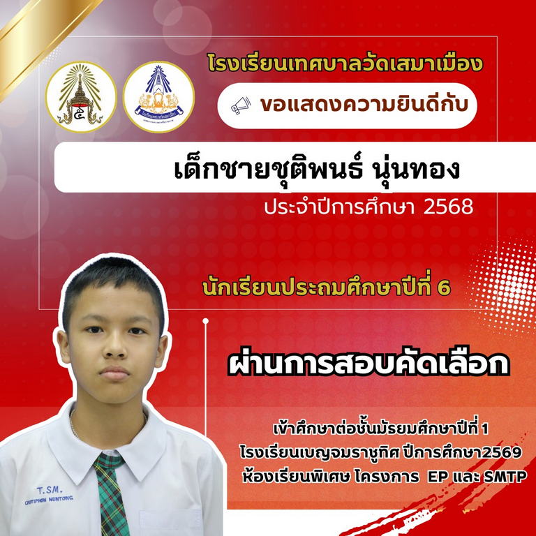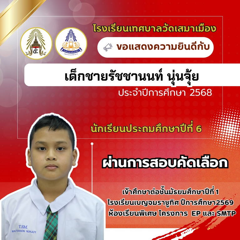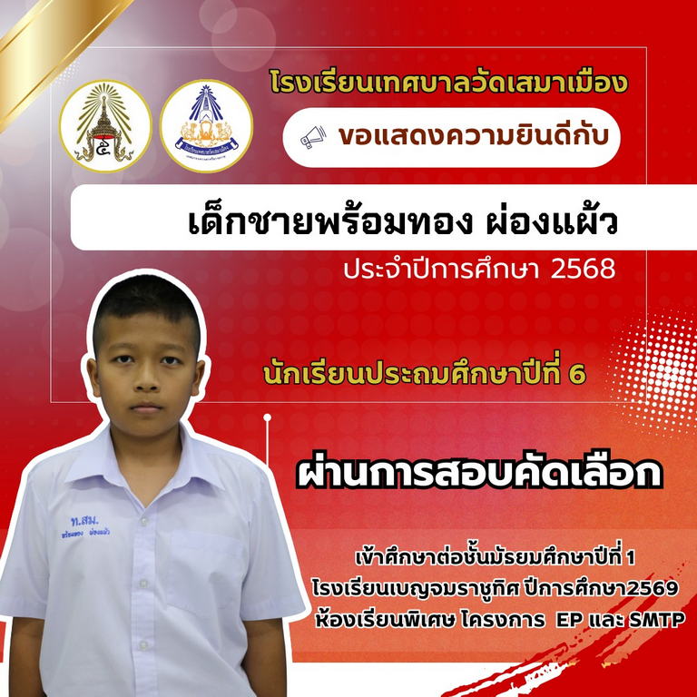 นายเกรียงไกร วุฒิมานพ ผู้อำนวยการสถานศึกษา พร้อมด้วยคณะผู้บริหาร คณะครู และบุคลากรโรงเรียนเทศบาลวัดเสมาเมือง ขอแสดงความยินดีกับนักเรียนชั้นประถมศึกษาปีที่ 6 ทุกคน ที่ผ่านการสอบคัดเลือกเข้าศึกษาต่อระดับชั้นมัธยมศึกษาปีที่ 1 โรงเรียนเบญจมราชูทิศ ปีการศึกษา 2569 ห้องเรียนพิเศษ รวมจำนวนนักเรียนสอบผ่าน 36 คน
